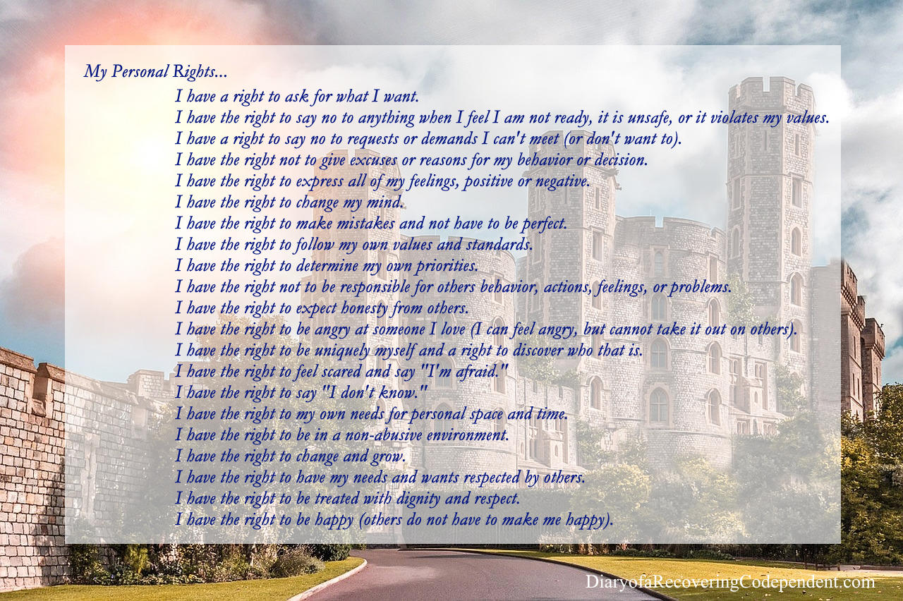 I learned about my personal rights. For some reason, somewhere way back in life, I forgot I had some basic personal rights. Thinking about it, I’m not really sure I ever really understood that I had any to begin with. It was never anything I thought about but when I started reading them, I realized how simple and true they were. It was like a light-bulb being turned on. What??? I have these rights? Well, yes I do! Watch out everyone, there is no stopping me now!