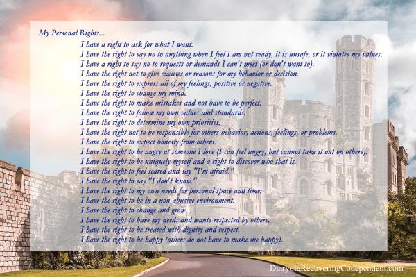 I was doing some reading about boundaries and personal rights and it made me think of a castle. My life is now a castle in all its glory and splendor. You're probably thinking, "how in the heck did you get from boundaries and rights, to your life is a castle?" Let me explain, as I... Continue Reading →